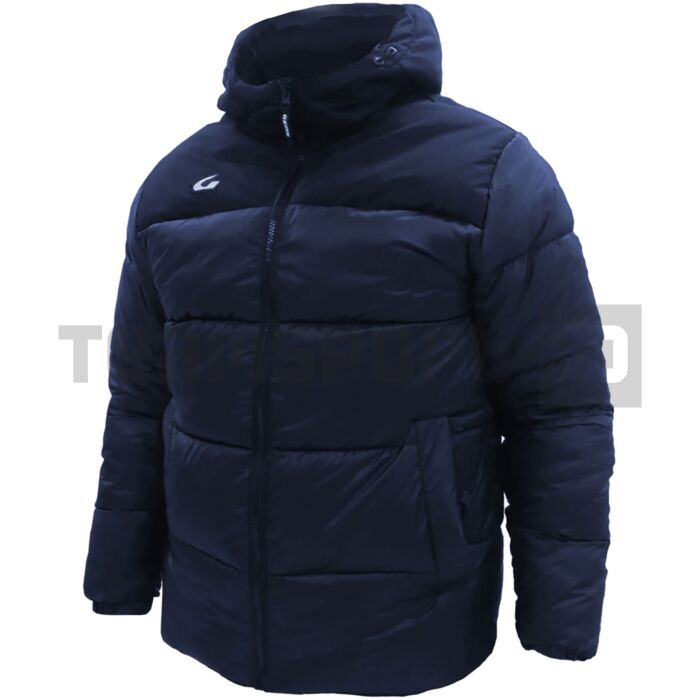 Collo alto, zip intera, tasche cappuccio, logo G di GEMS ricamato, a tinta unita; dal torace in su (compreso il cappuccio) è stato utilizzato un tessuto crespo.