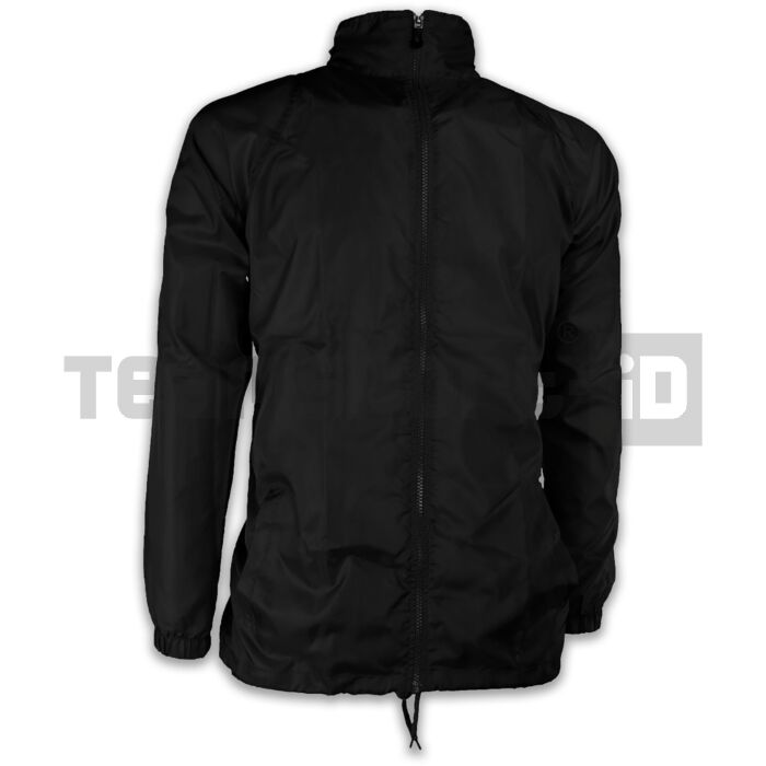 GIACCA ANTIVENTO BASIC realizzata in fibre di nylon altamente resistente; NO BRAND, dotata di cappuccio, collo alto, zip intera, polsini elasticizzati, laccetto ed elastico in vita.