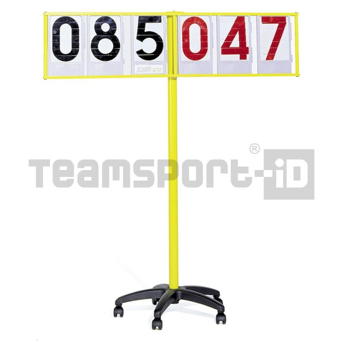 Segnapunti meteore a stelo a 6 tabelle, telaio verticale in acciaio diam mm 50 verniciato epoxi, telaio porta tabelle girevole, base con ruote per trasporto, 6 tabelle METEORE ( 3 nere 3 rosse) composizione punteggio istantanea, visualizzazione a tendina